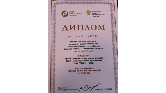- Мне очень приятно и важно победить именно в профессиональном конкурсе журналистов, – отметила Мария. – Быть руководителем медиахолдинга «Брянская Губерния» – значит быть примером для журналистов, операторов, монтажеров. Весь материал в Суджанском районе я снимала сама, монтаж осуществлял профессионал Денис Трофимов. Наша команда сильная, грамотная и сплоченная, и эта награда – еще одно подтверждение нашего профессионализма.